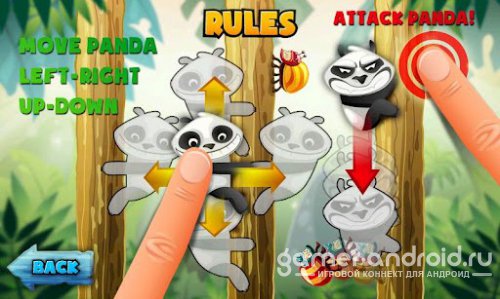 Панда может убегать от жуков, перебираясь с одной стороны дерева на другую, с одного дерева на другое. Она так же может атаковать съезжая вниз по дереву, сметая жуков на своём пути.