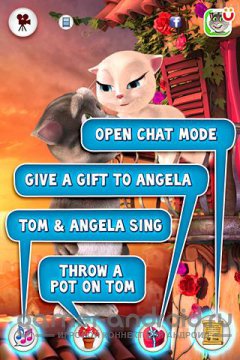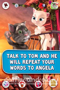 Том любит Анджелу - Говорящий кот Том возвращается к нам, теперь он влюбился в Анджелу и хочет завоевать ее сердце. Он поднялся на крышу, чтобы посмотреть на Анджелу. Том пытается ухаживать за Анджелой и будет передавать ей твои слова, но у Тома есть соперник - Джинджер. Это первое приложение " Говорящие Друзья". Помимо разговоров вы можете петь песенку, дарить подарки и многое другое.