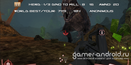 Dino Hunter - Охота на динозавров, в игре вам предстоит охотиться на таких динозавров как: Hankylosaurus, Carnotaurus, Spinosaurus, Стегозавр, Tiranosaurus, Velociraptor выполняя различные миссии на время. Из арсенала у вас будет различное оружие в том числе и винтовка с которой вы можете целится с прицела, не тратьте много пуль они вам пригодятся...