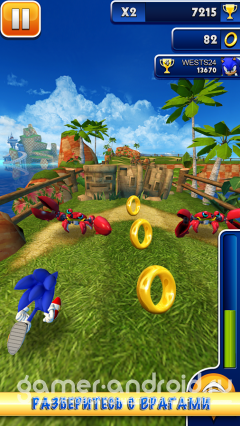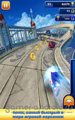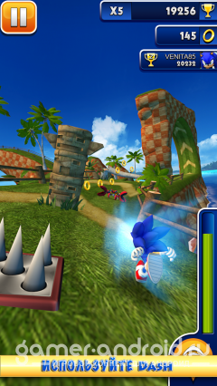 Sonic Dash - долгожданная игра про самого быстрого героя, Sonic. Вас ждет потрясающий 3D мир, много препятствий, врагов и главный злодей Зазз. Ваша задача удержаться на тропе как можно дольше, применять различные способности. Так же у героя есть супер навык Dash, с помощью которого вы сможете сбивать преграды на вашем пути.