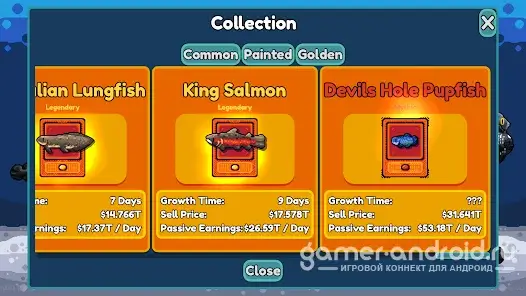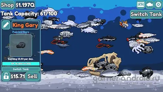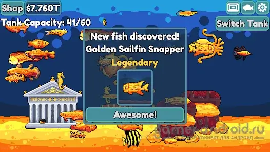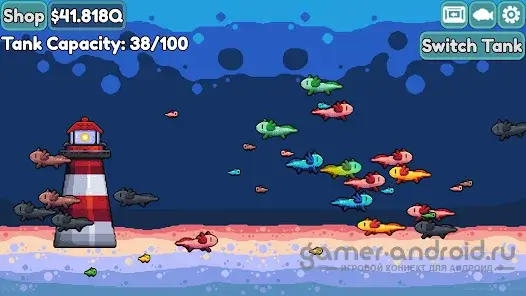 Игрок покупает рыбок, кормит их и наблюдает за их ростом в реальном времени. Постепенно открываются новые виды, включая редкие и необычные экземпляры.
