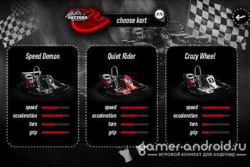 Daytona Racing Karting Cup - представляю Вам очень занятную игру, для всех кто любит быструю езду! В этой игре, Вы будете управлять небольшим, но очень быстрым гоночным картом. Выберете себе понравившийся карт из трех представленных гоночных картов и вперед на трассу! В данной игре, Вас ждут шесть различных трасс, на которых Вы должны показать лучшие время, чтобы победить.