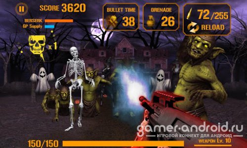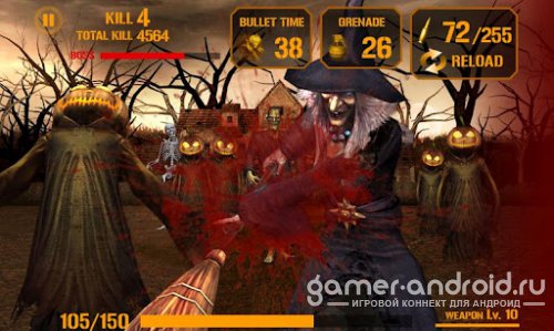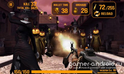 GUN ZOMBIE : HALLOWEEN - в этой игре, Вас ждут толпы нечистой силы, которая жаждет убить Вашего героя! На Хэллоуин повылазило, очень много ужасных существ: зомби, скелетов, ведьм, злых призраков и т.д. Берите оружие и вперед на защиту города от нечисти, убивайте как можно больше злобных существ, получает бонусы и покупайте новое оружие. В игре Вас ожидает более 38 видов оружия, а также 150 больших уровней в режиме кампания, уничтожайте цели и получайте различные награды.