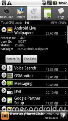 Также приложение имеет свой встроенный менеджер задач и менеждер установленных приложений.
