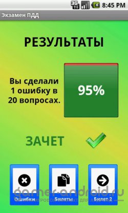 Экзамен ПДД 2013 ABCD Россия Обновлено: 20.03.13 Версия: 1.12 Требования: Android Android 1.6+ Жанр: Программы » Образование » Билеты ПДД Размер: 23.19 MB Мб Наша оценка 0 В избранное Скачать Запросить обновление 0 0 Экзамен ПДД 2013 ABCD Россия - программа поможет вам подготовиться к сдачи экзамена ПДД в России. Билеты отсортированы по категориям ABCD, 40 билетов со всеми новыми изменениями, удобный просмотр ошибок. Подойдет для любых экранов. Подробнее Скачать Экзамен ПДД 2013 ABCD Россия Андроид бесплатно Экзамен ПДД 2013 ABCD Россия Размер: 23.19 MB Мб, Скачали ~10 608 раз. .apk Скачать Комментарии Минимальная длина комментария - 50 знаков. комментарии модерируются Отправить Владимир 9 сентября 2013 17:28 Да 0 Нет 0 Экзамен ПДД (билеты) явно устаревшие, нет обновлений на 1.03.13 и 1.09.13 охонов кобил 12 февраля 2014 18:14 Да 0 Нет 0 класс, Очен хороший