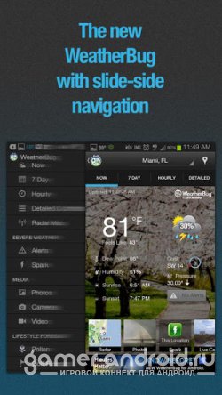 WeatherBug - самый точный прогноз погоды для Android телефонов и планшетов. В программе вы сможете выбрать разные темы оформления и настроить программу на свой город. Вы сможете просматривать погоду на ближайшие 24 часа или же на неделю. Программа довольно с красивым и понятным интерфейсом. Также в программе есть метеорологические датчики, которые точно указывают. Нужная программа для каждого телефона и планшета.