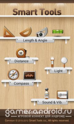 Smart Tools - набор полезных инструментов для вашего Android. Приложение позволяет измерять угол наклона, длину, растояение до цели, ширину и высоту цели, есть виброметр, измеритель уровня шума, GPS – компас, металлоискатель (для него используется элемент g-sensor’а). Хорошее приложение, очень интересно производить измерения с его помощью, посмотрите на скриншоты и увидите все сами.