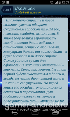Гороскоп 2014 Обновлено: 30.01.14 Версия: 1.0 Требования: Android Android 2.1+ Жанр: Другое Размер: 1.84mb Мб Наша оценка 0 В избранное Скачать Запросить обновление 0 0 Гороскоп 2014 - приложение для android с гороскопами на год, месяц и каждый день. Все знаки зодиака. Благодаря гороскопу вы сможете понять где вам стоит быть осторожнее и как лучше себя повести.Фото Гороскоп 2014 Подробнее Скачать Гороскоп 2014 Андроид бесплатно Гороскоп 2014 Размер: 1.84mb Мб, Скачали ~19 937 раз. .apk Скачать Комментарии Минимальная длина комментария - 50 знаков. комментарии модерируются Отправить Комментариев еще нет. Вы можете стать первым!