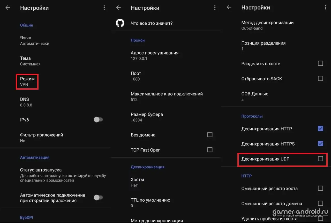 - Вам нужно поставить галочку в настройках ByeByeDPI > Десинхронизацию UDP;