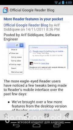 Google Reader - Удобная читалка новостей с блогов и сайтов. С помощью данной программы можно подписаться на огромное количество RSS каналов и читать только свежие новости мира или определенного сайта. Также приложение позволяет делится интересными новостями с друзьями.