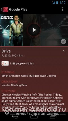 Google Play Фильмы - Официальное приложение от Google с помощью которого вы сможете покупать, брать на прокат или скачивать фильмы с Google Play для просмотра на своём Android устройстве. Помимо этого вы сможете открыть свою собственную коллекцию фильмов.
