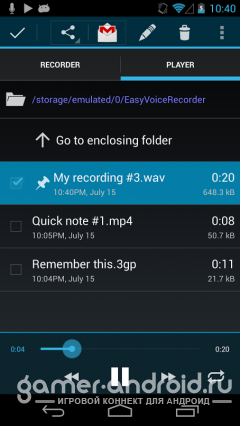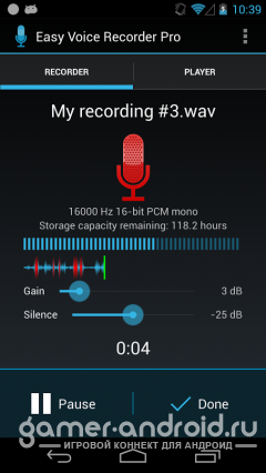 Easy Voice Recorder Pro - хороший и простой диктофон для Android Обновлено: 05.08.13 Версия: 1.7.4 Требования: Android Android 2.0+ Жанр: Мультимедиа » Диктофоны Размер: 1.89mb Мб Наша оценка 0 В избранное Скачать Запросить обновление 0 0 Upd Easy Voice Recorder Pro - очень хороший диктофон для Android. Его преимущество в том, что он записывает файлы с наилучшим качеством и с минимальным размером. Диктофон так же имеет множество полезных настроек, которые помогут вам.Фото Подробнее Скачать Easy Voice Recorder Pro - хороший и простой диктофон для Android Андроид бесплатно Easy Voice Recorder Pro - хороший и простой диктофон для Android Размер: 1.89mb Мб, Скачали ~13 184 раз. .apk Скачать Комментарии Минимальная длина комментария - 50 знаков. комментарии модерируются Отправить Комментариев еще нет. Вы можете стать первым!