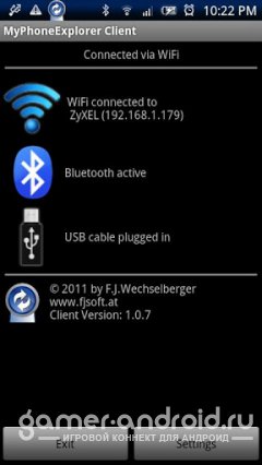 Для работы с MyPhoneExplorer вам необходимо поставить не только само приложение, но и клиент для ПК. Приложение поддерживает русский язык. Сразу после запуска вы можете подключиться к вашему гуглофону через wifi или по кабелю, затем MyPhoneExplorer предложит вам все синхронизировать.