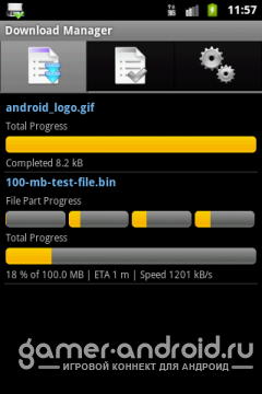 Простой, но функциональный менеджер закачек на Android, позволяющий закачивать один файл в несколько потоков. Приложение имеет версию для Android 3.x и 4.x, данная версия для 2.1+.