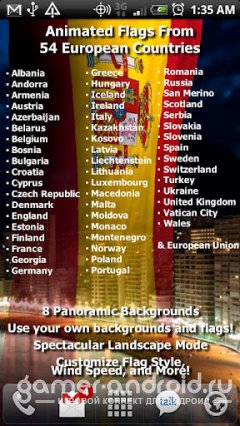 EU Flags Live Wallpaper - Живые обои в виде флагов Европы. Это полная версия обоев, которая включает в себя большинство Европейских флагов в том числе и Российский.
