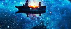 Очень красивые обои на которых вы будете наблюдать ночной пейзаж в темно синих тонах, но воне которого расположено озеро с лодкой и парочкой влюбленных.