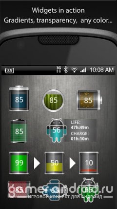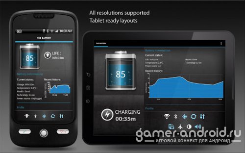 The Battery Pro - Стильный индикатор батареи в HD качестве и набором виджетов для рабочего стола Android. Программа позволяет получить оценку аккумулятора, время заряда и мгновенно отключить системные функции (WiFi, Bluetooth, GPS, Звук...) для экономии заряда батареи. Само приложение  The Battery оптимизировано и не тратит много заряда.