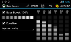 Bass Booster - мощный музыкальный эквалайзер, который поможет вам настроить нужное качество музыки. Вы сможете выбрать уже варианты разных эквалайзеров, которые вы можете выбрать или же создайте свой, который будет звучать наиболее лучше. Вы сможете выставить виджет любой настройки на рабочий стол в качестве виджета, и в любой момент включать прямо с рабочего стола.
